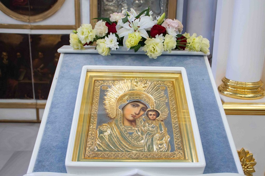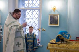 За Божественной литургией на сугубой ектении были возглашены особые прошения об Отечестве нашем и защитниках его. По заамвонной молитве состоялось славление Божией Матери.